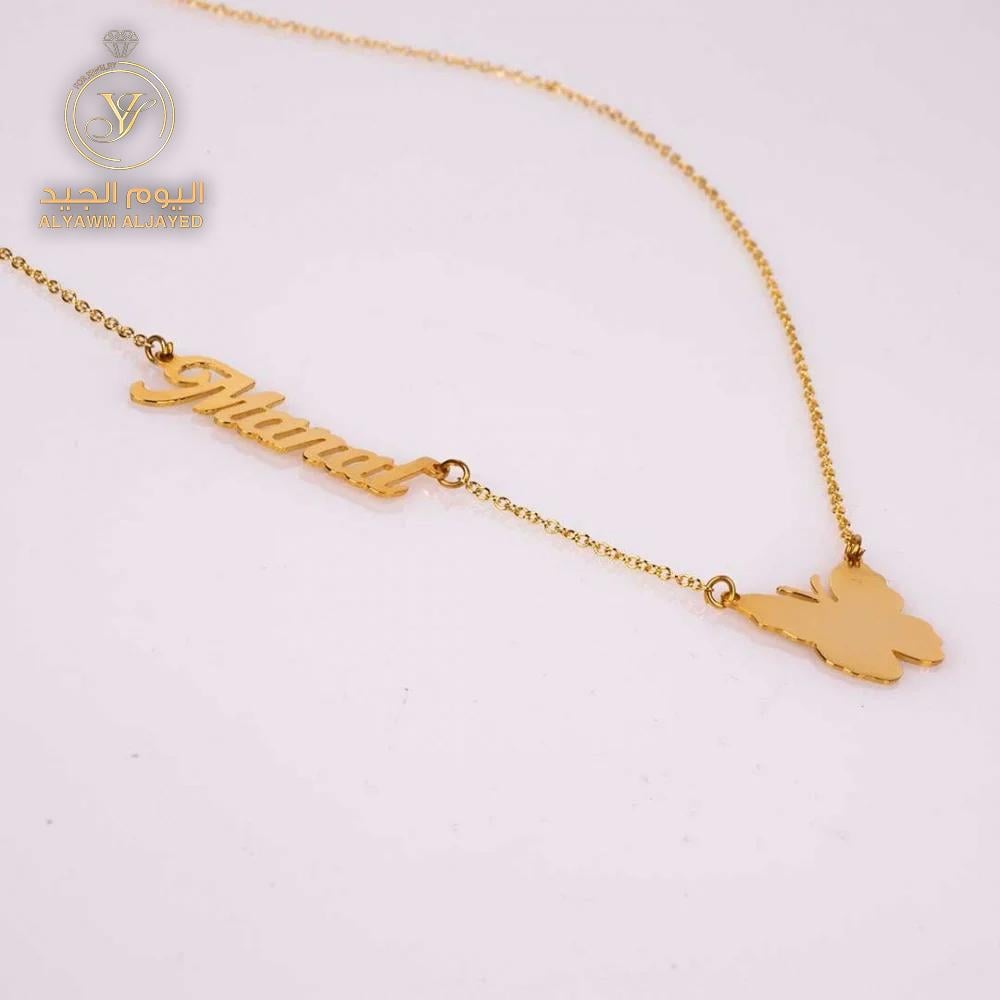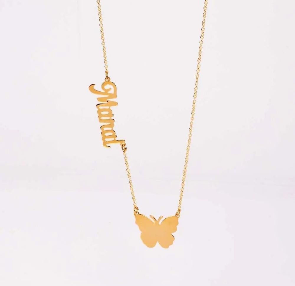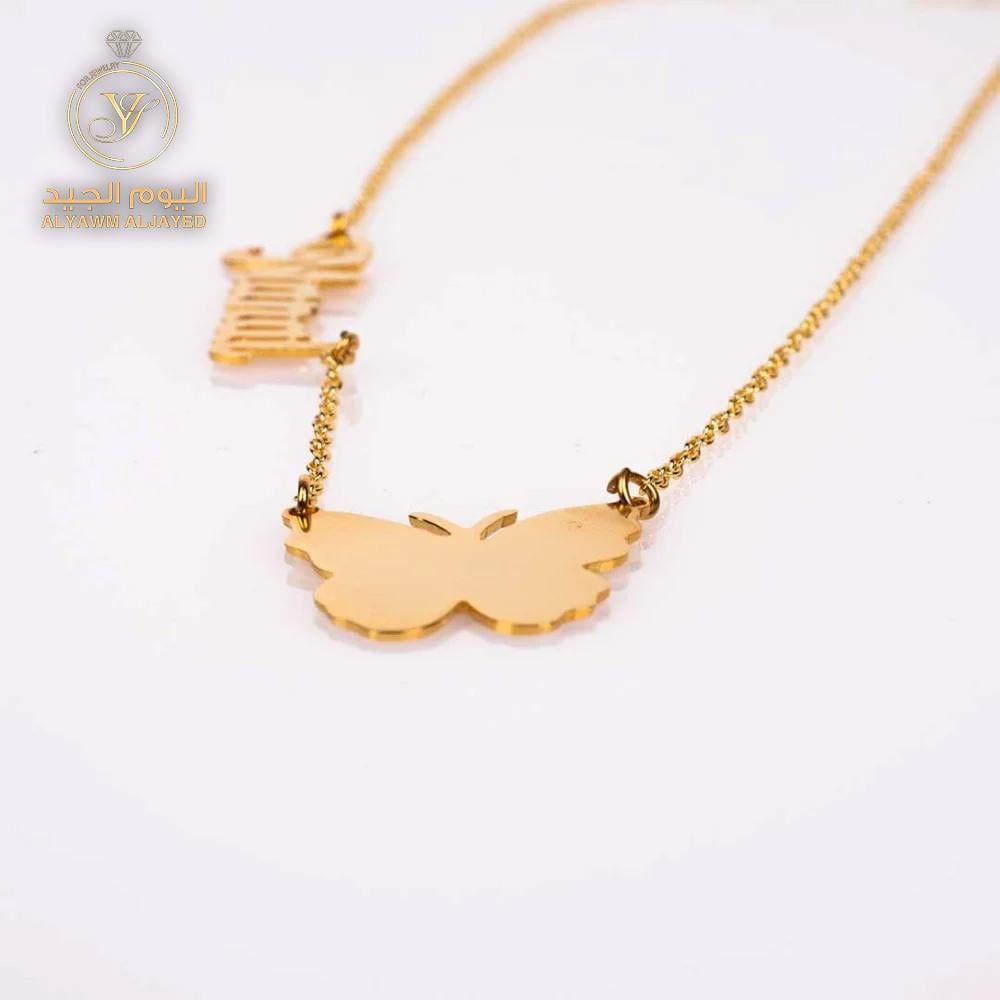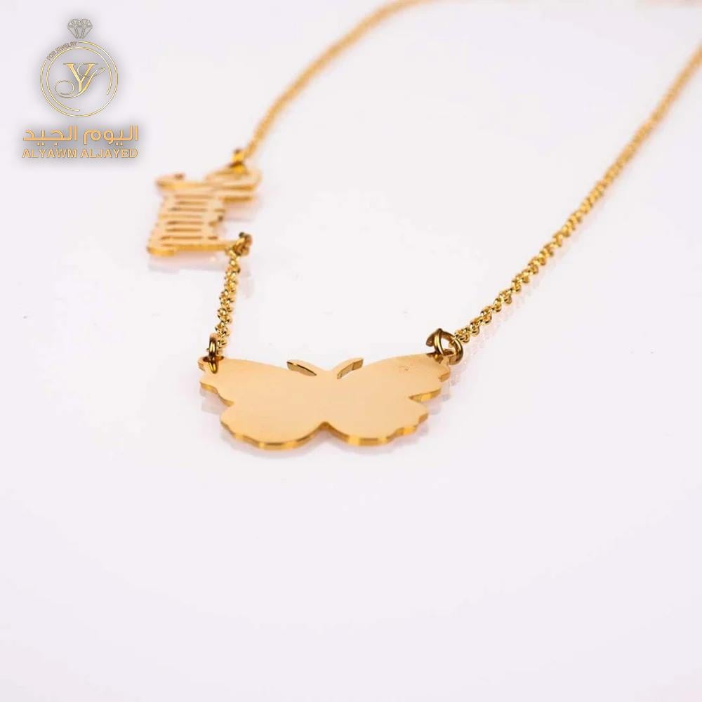 سلسال فراشه بالاسم ليس مجرد قطعة مجوهرات، بل قطعة تعكس الجمال الطبيعي بتصميم فريد حيث تظهر فراشة بأجنحة مرفرفة في الجزء السفلي للسلسال، مع اسم شخصي محفور بارتفاع على الجانب الأيمن.