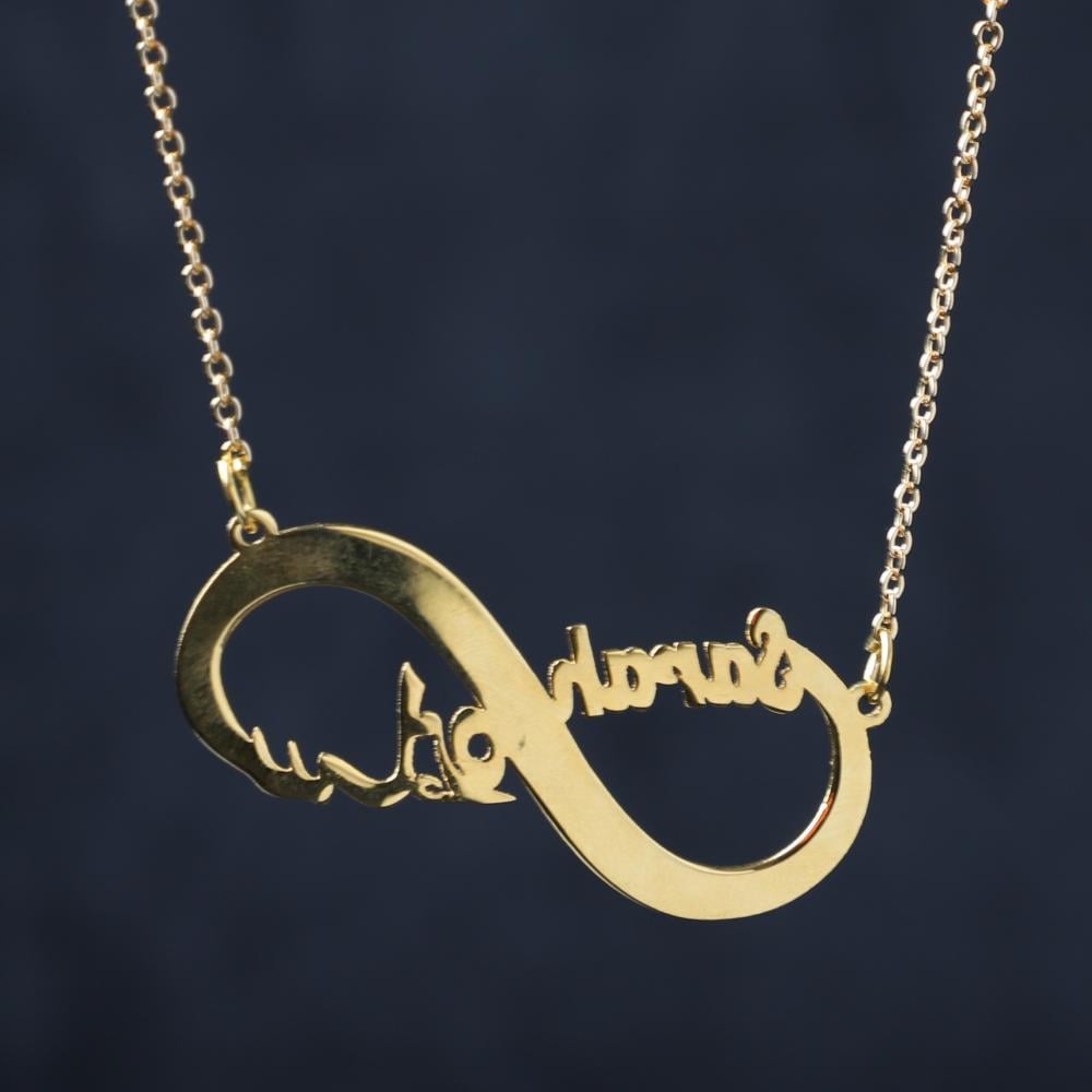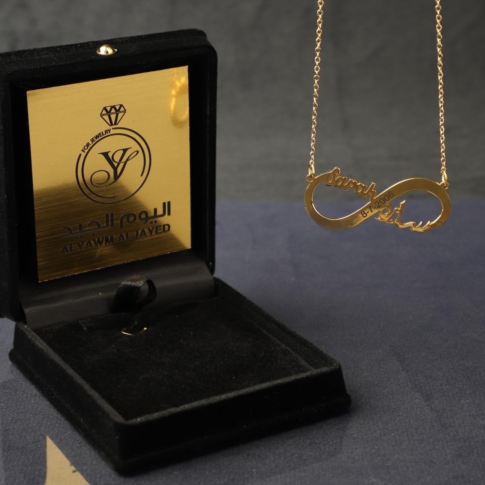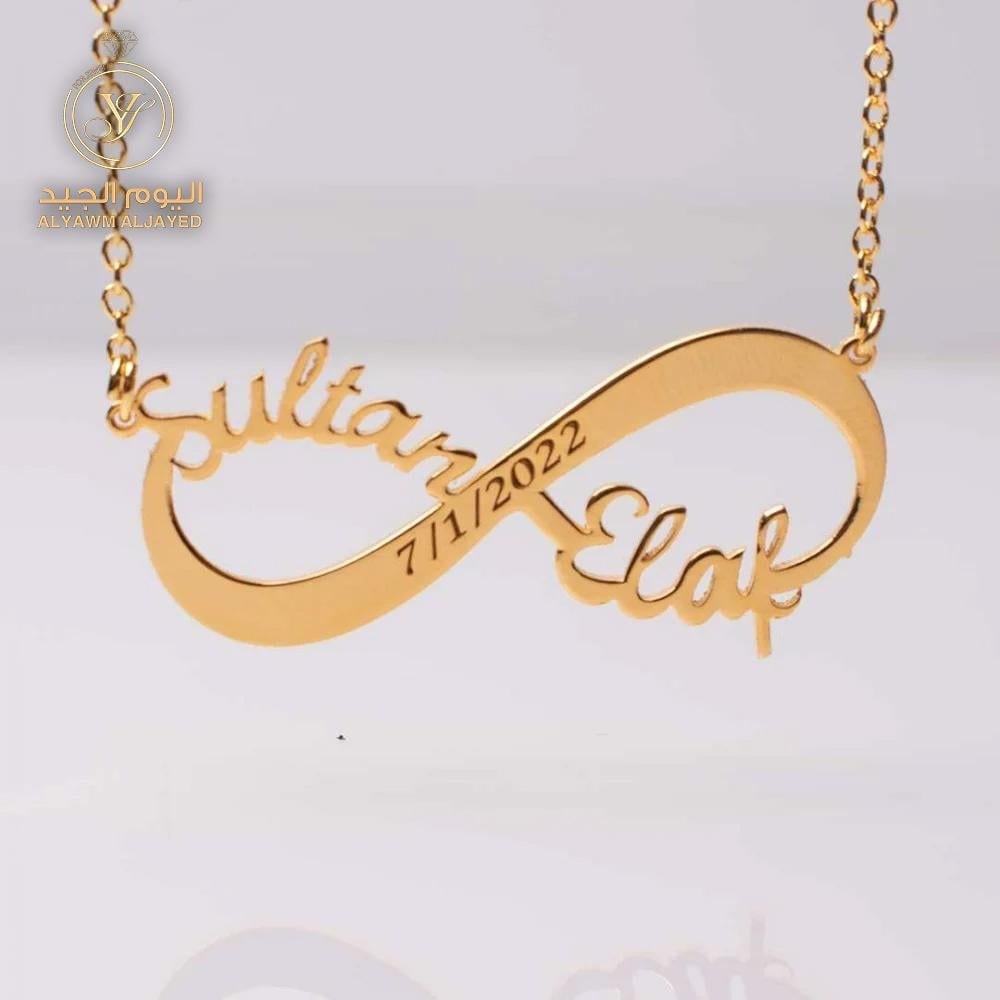 سلسال اسمين علامة اللانهايه او انفنتي هو تصميم يعكس الارتباط الأبدي واللامحدود من خلال شكل الرقم 8 المقلوب أفقيًا، والذي يرمز إلى اللانهاية. يحتوي السلسال على اسمين محفورين بعناية على كل جانب، مما يضفي طابعًا شخصيًا ومميزًا على القطعة.