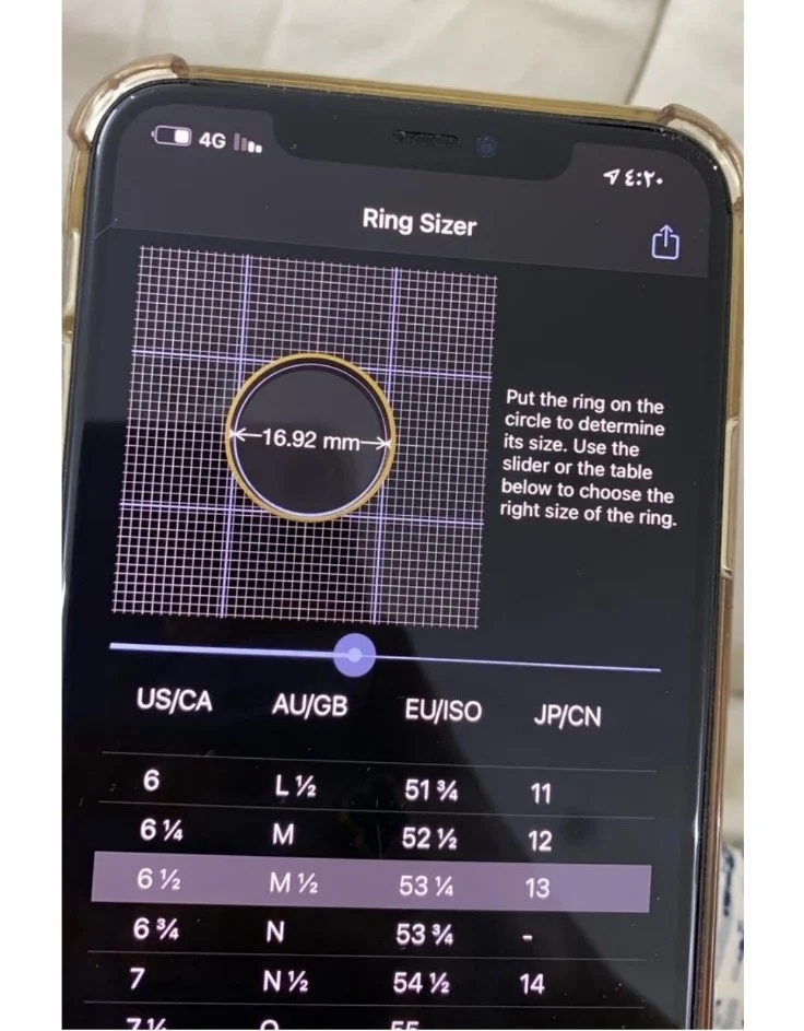 2- ضع الخاتم على الدائرة الظاهر في التطبيق لمعرفة المقاس